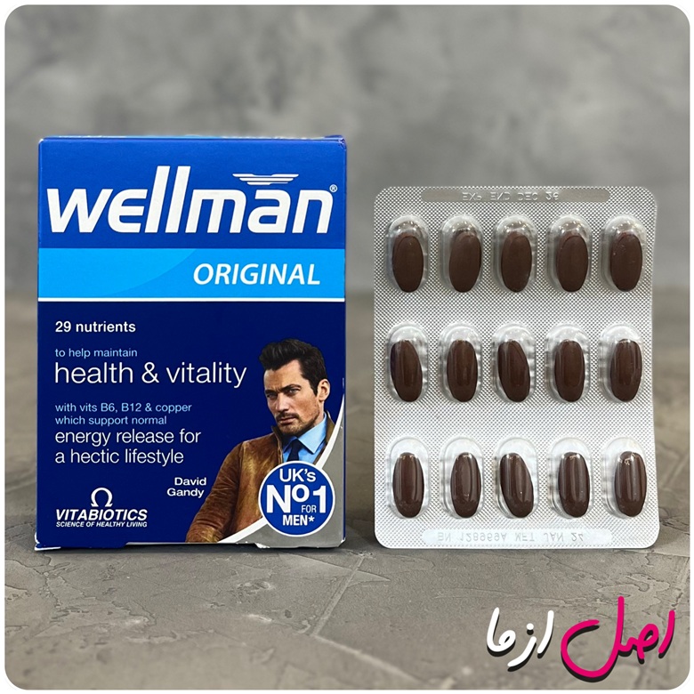 قرص ول من اورجینال مولتی ویتامینی کامل و جامع با تمامی ویتامین ها و مواد معدنی مورد نیاز بدن آقایان از برند معروف ویتابیوتیکس انگلستان می باشد و به حفظ سلامت بدن، پوست و مو، تقویت سیستم ایمنی و قوای جنسی، بهبود باروری و افزایش انرژی آقایان می پردازد. قرص Wellman ویتابیوتیکس با داشتن 29 ماده از ویتامین ها، اسیدهای آمینه، مواد معدنی و عصاره جینسینگ یکی کامل ترین ترکیبات را در میان مولتی ویتامین های مخصوص آقایان دارد. وجود ترکیباتی مانند زینک، ویتامین E، کوآنزیم کیوتن، ال آرژنین و دیگر مواد معدنی باعث حفظ سلامت و افزایش قدرت و توانایی جنسی شده و در درمان اختلالات نعوذ و زودانزالی آقایان نقش چشمگیری دارد.